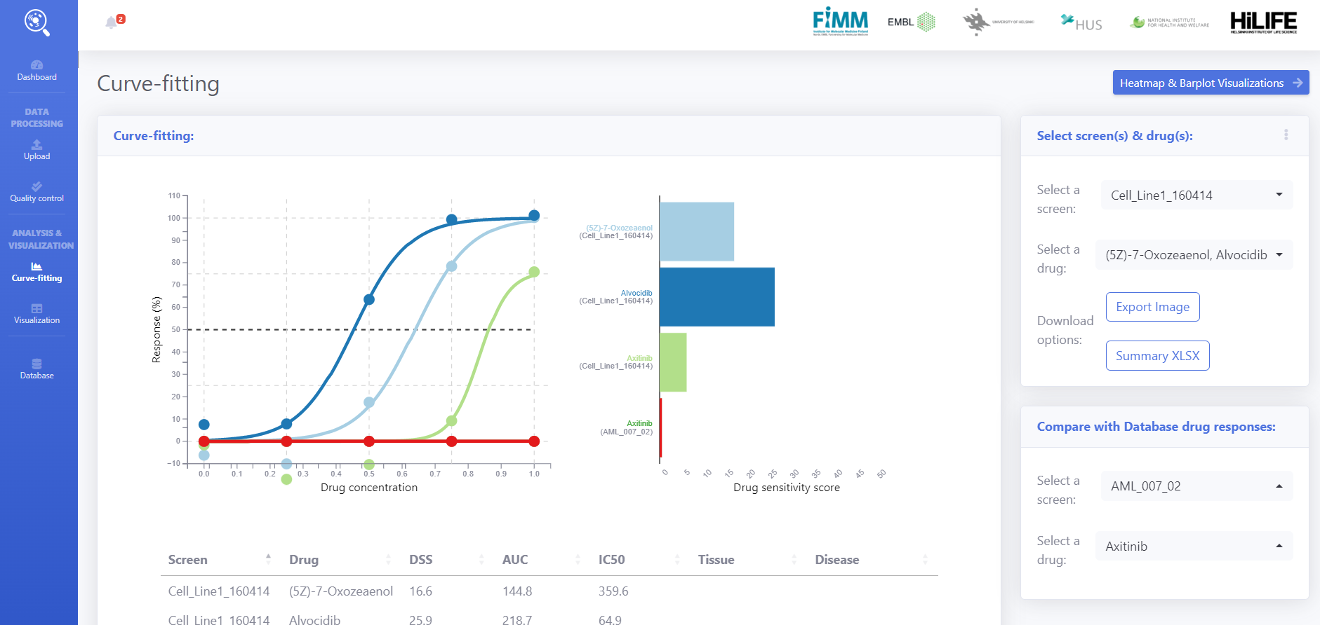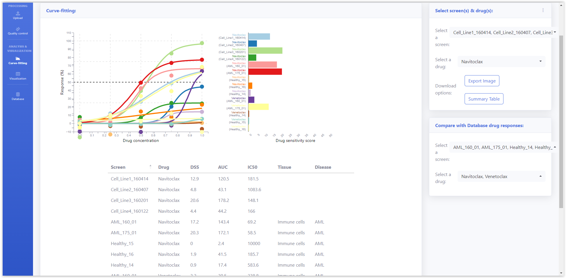 On the right panel, User can select one or more screens and drugs from the newly analysed data and the published data from database. Summary table in the bottom panel shows the drug quantification metrics.