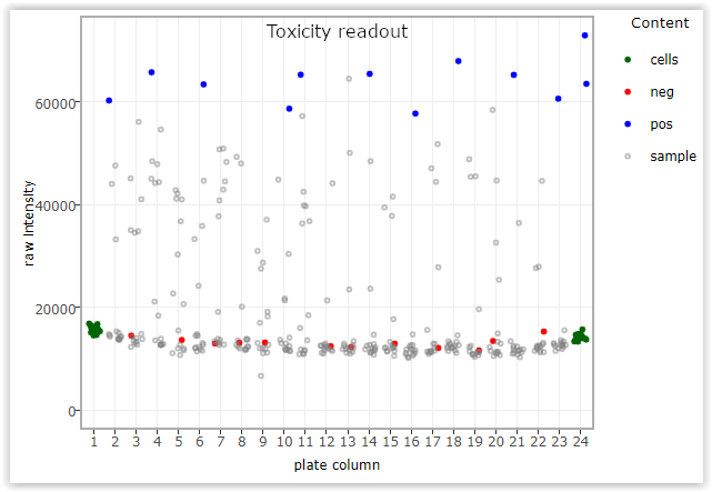 As expected in the toxicity readout, the BzCl wells will give more signal and bigger intensity values and DMSO wells will have very small signal.