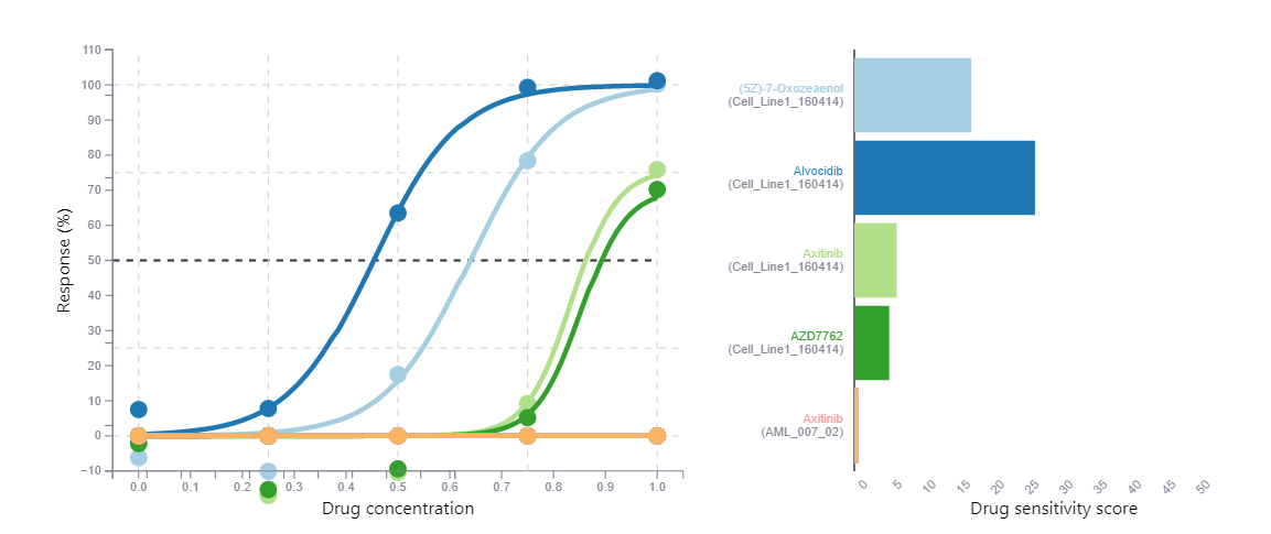 By clicking on the drug name, you can view and compare dose-response curves across all the samples. Please note, that we implemented different distance metrics for heatmap clustering. Euclidean distance is used as default option, but other options, such as Pearson correlation, were shown to be powerful to detect similarities between drug response profiles.