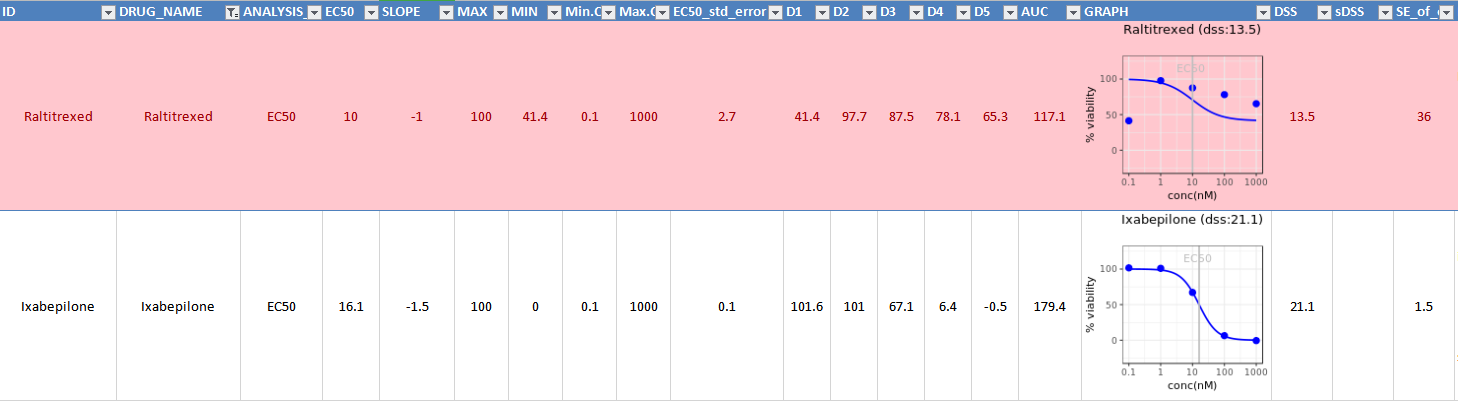 We utilized machine learning based approach for marking bad quality dose-response curves (in red color). This is how it is displayed in the report excel files: