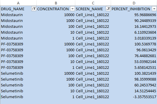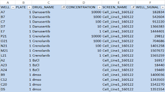 1. Raw data format: Raw data (raw plate reader output data, unprocessed or preprocessed measurements from drug screening experiment) arranged in tabular format which can be run through the pipeline of QC, dose response curve fitting, IC50, EC50, DSS etc.