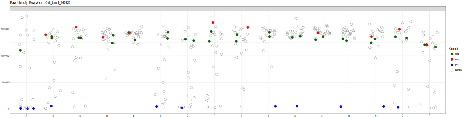 The application generates plate level scatterplots of the raw data indicating different controls and samples. Users can look for trends in the distribution of the raw data.