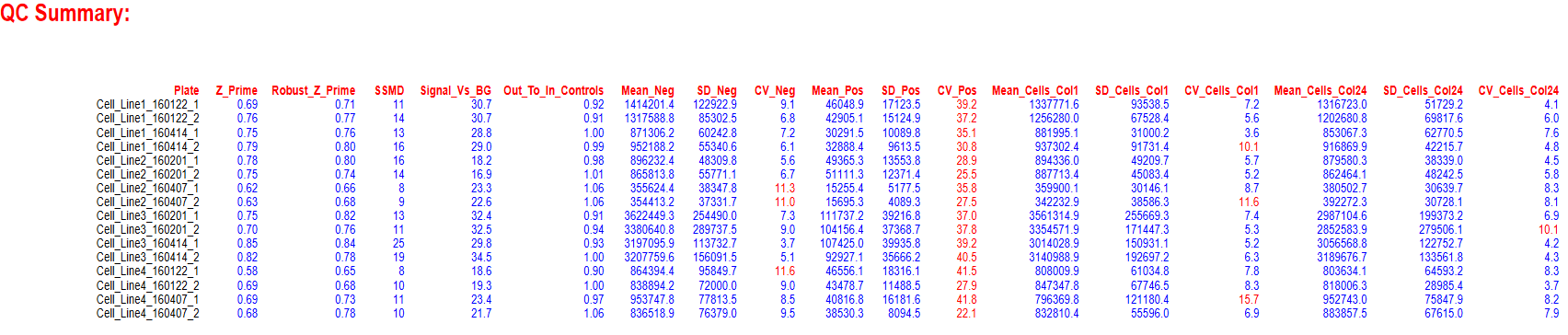 For a good quality plate, Z’ should be above 0.5 and SSMD above 7. Out_To_In_Controls should be between 0.9 and 1.1, while CV_Neg and CV_Pos below 10.
