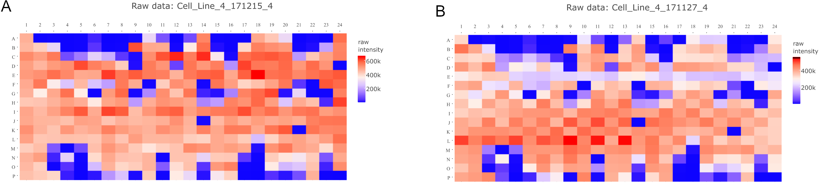 Plot A and B represent data from the same drug set and same cell line screened at two different time points. In plot B, unusually low numbers are present throughout row E, possibly resulting from dispensing issues and checkerboard pattern is evident in rows H to M.