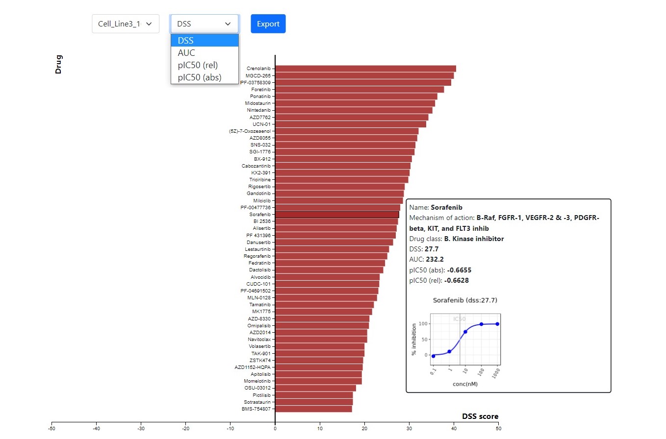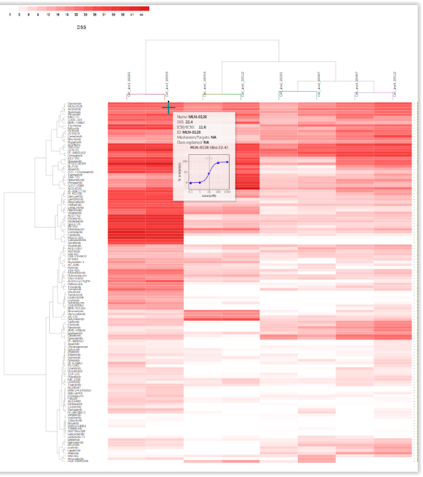 AUC and DSS scores are reported in the form of the excel-tables of all the screens as well as interactive graphics such as heatmaps.
