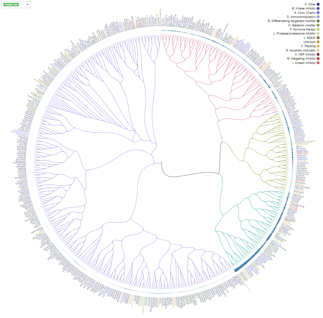 Clustering tree is a radial dendrogram for each drug with corresponding DSS values.It shows the mean DSS value across all the samples by hovering over the blue dots on the tree.